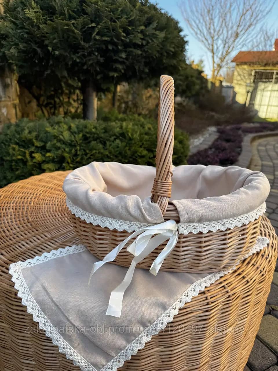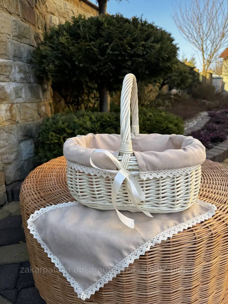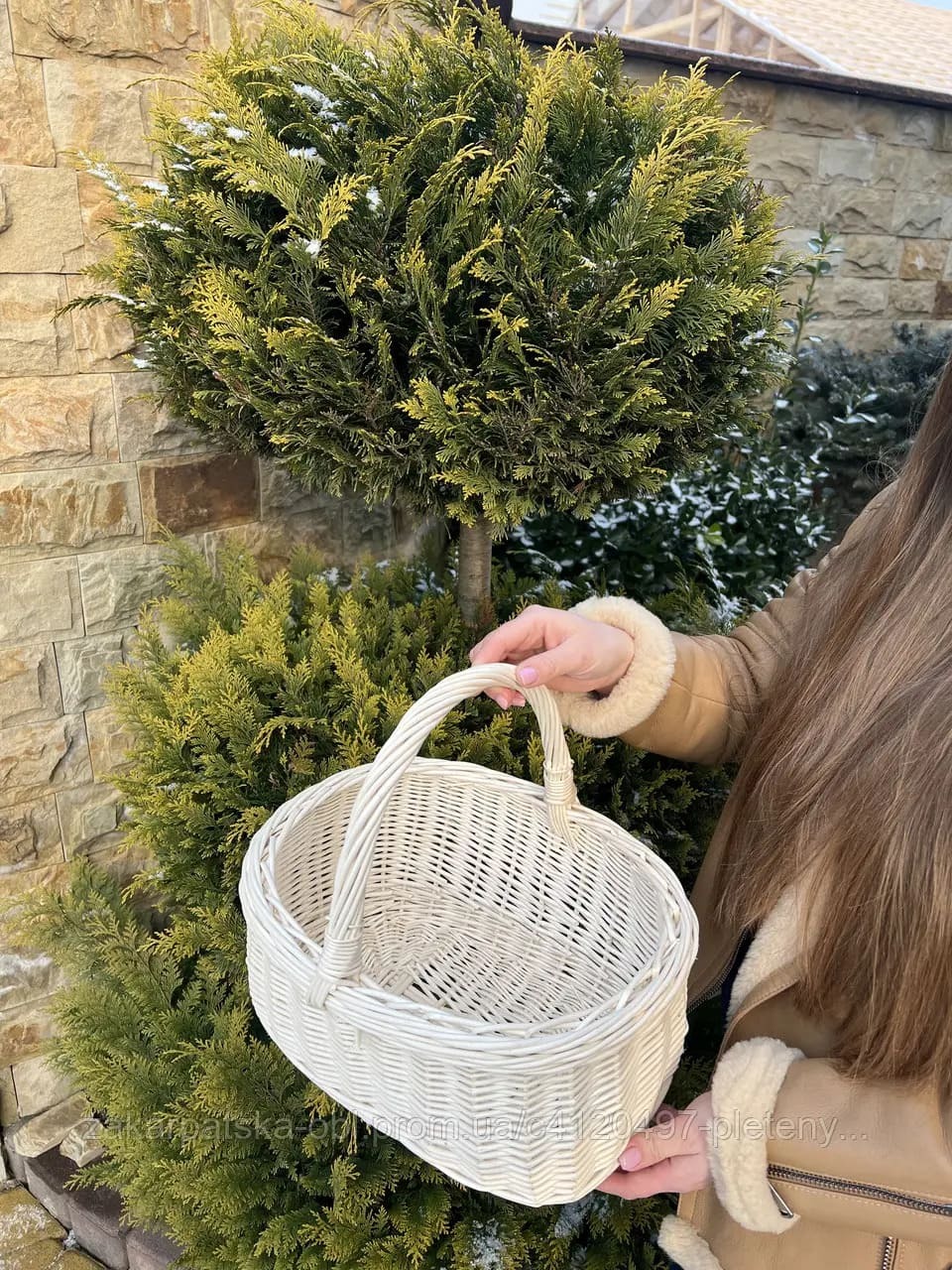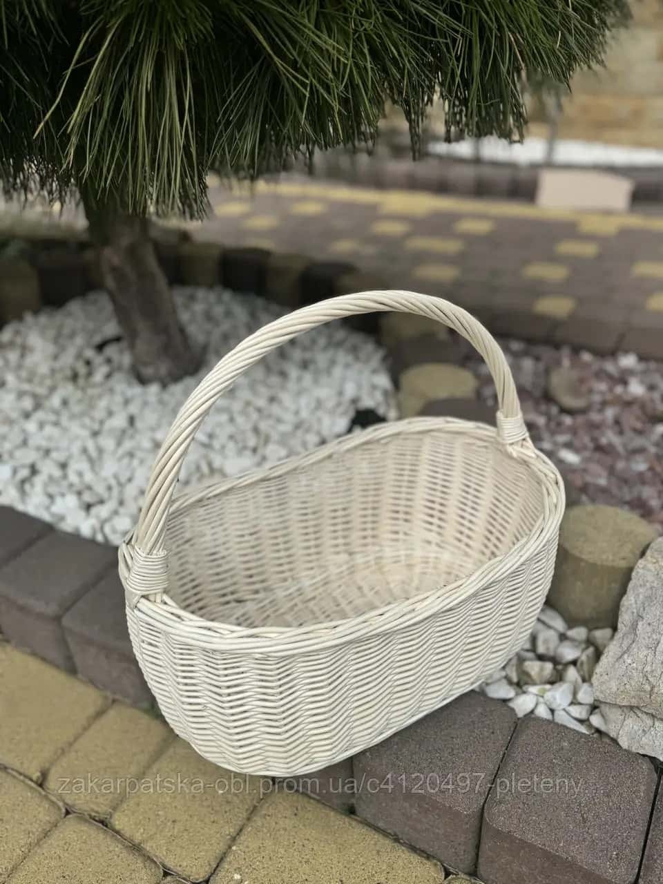 Виготовлено із природної білої лози. Якісне плетіння, цільна лоза. Середній розмір корзинки.