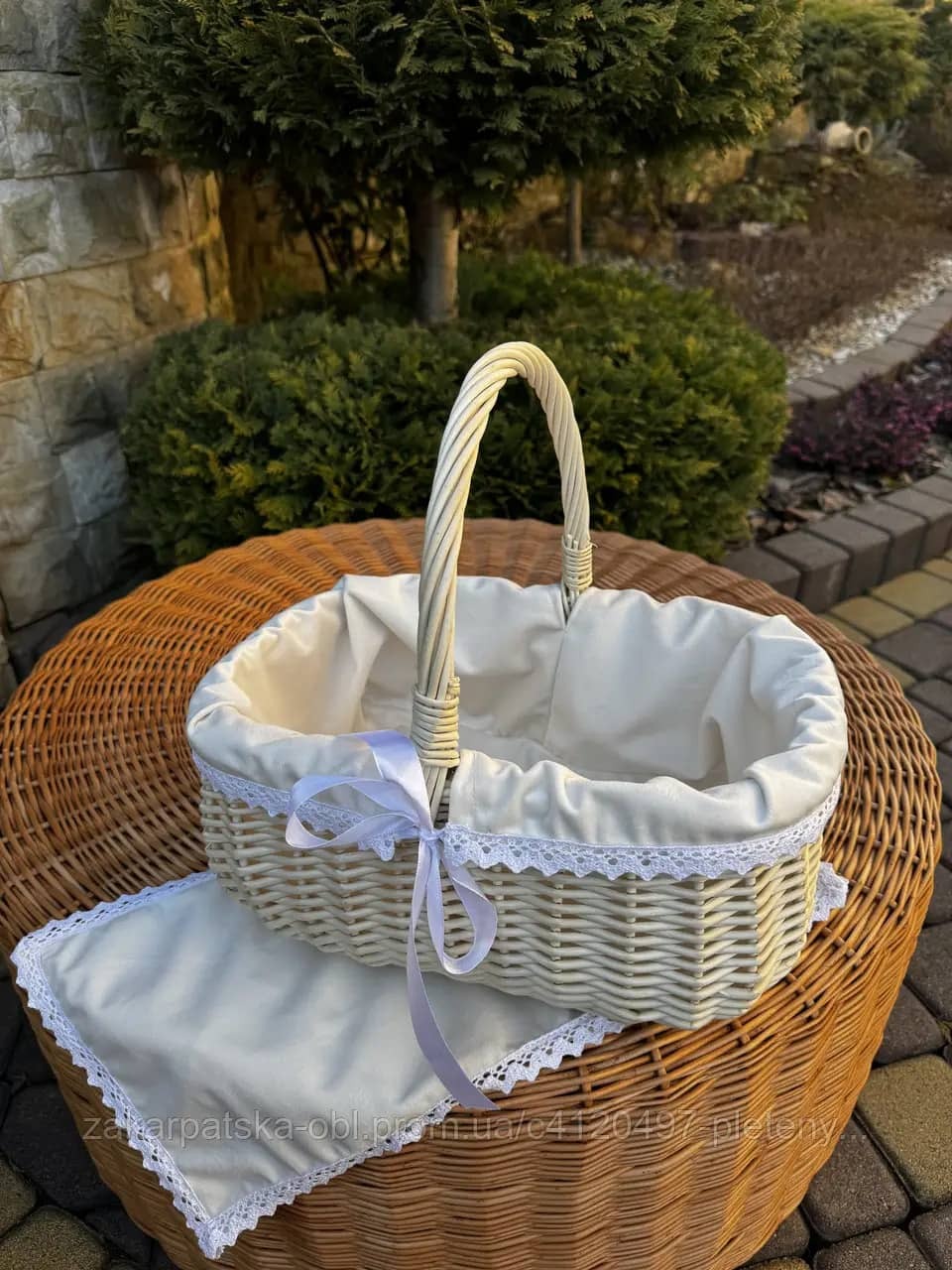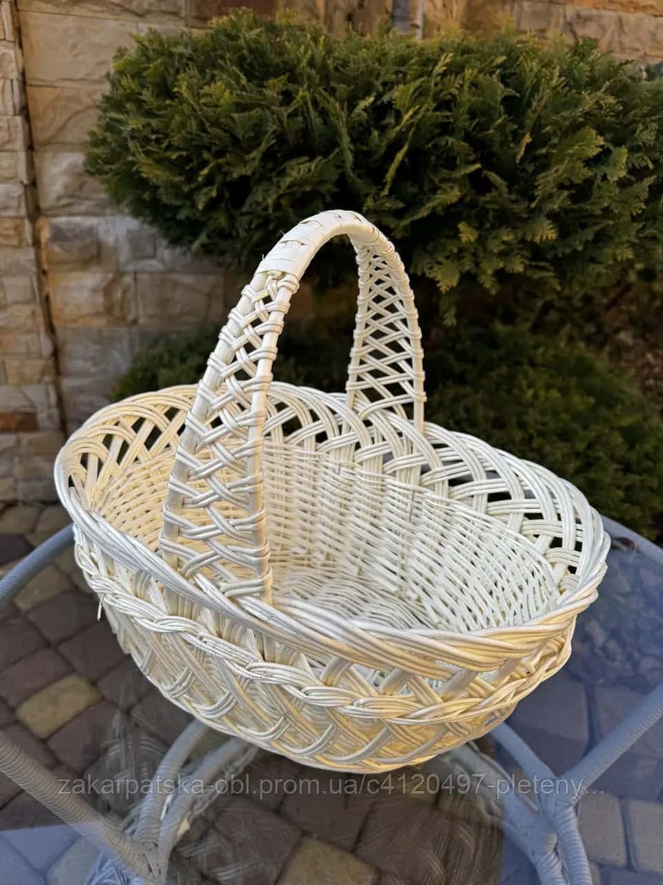 Виготовлено із природної білої лози. Якісне плетіння, цільна лоза. Середній розмір корзинки.