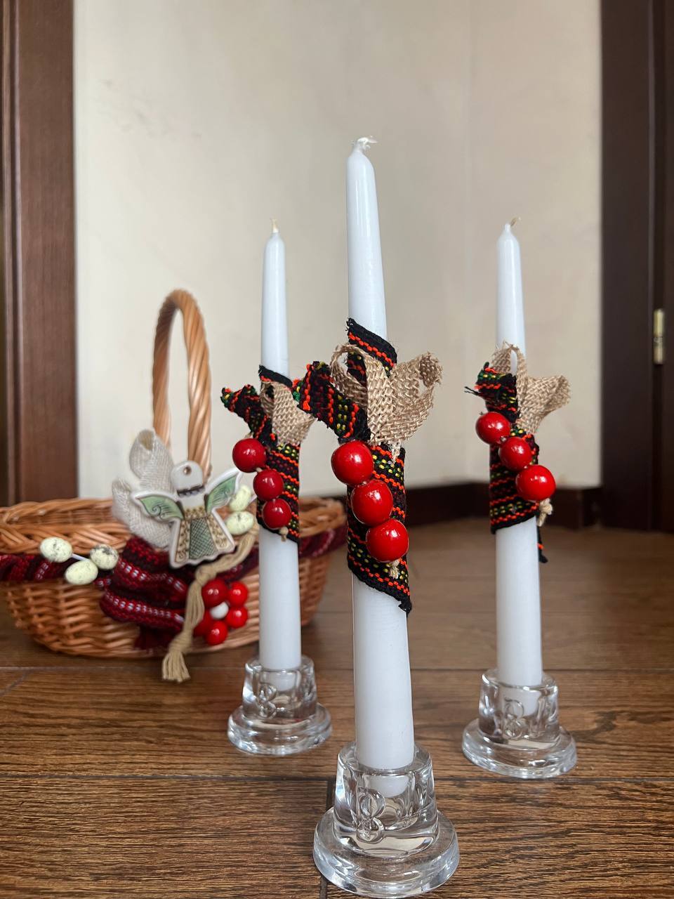 Кожна свічка прикрашена вручну: стрічками, текстильними елементами, мініатюрними квітами та декоративними яєчками, що створюють атмосферу тепла й затишку. Поєднання натуральних відтінків — білого, зеленого, бежевого — виглядає дуже естетично та гармонійно.