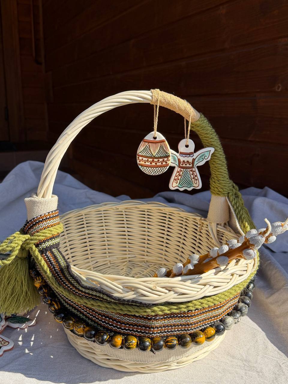 Ця пасхальна корзина стане невід'ємною частиною вашого святкового декору, надаючи особливого дотику весняного відродження та вражаючи гостей своєю красою та символікою